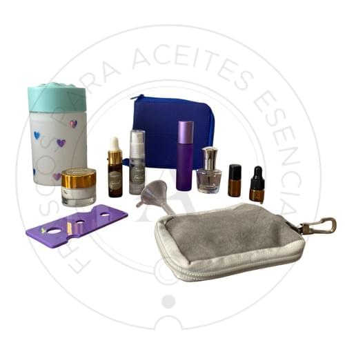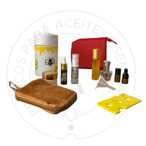 Difusor decorado, keychain, estuche porta roll ons, roll on de color, roll on 2ml ámbar bolita de cristal, gotero 1ml ámbar, frasco tipo barniz, llave suiza, embudo, crema de karité 10g, suero facial, tónico facial.